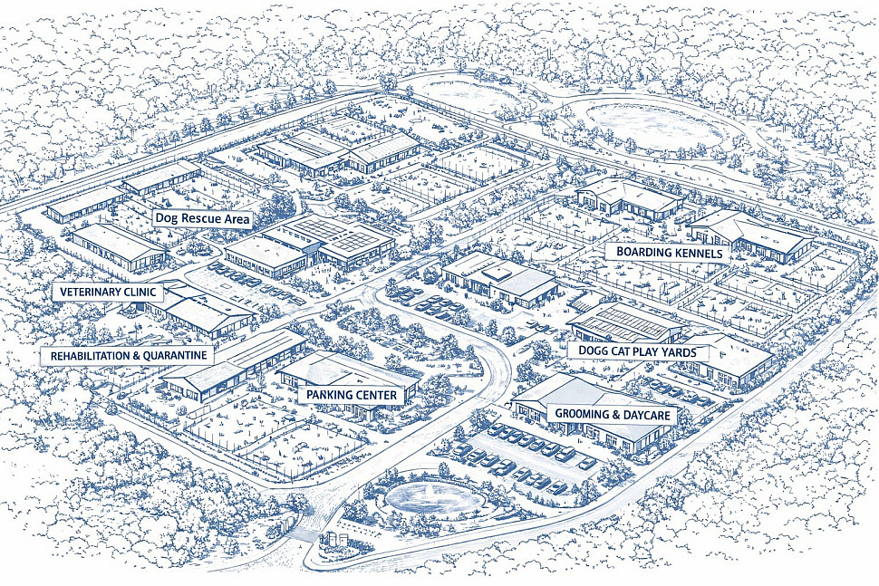 The proposed campus will serve up to 2,000 animals and combine both nonprofit rescue operations and professional animal care services.